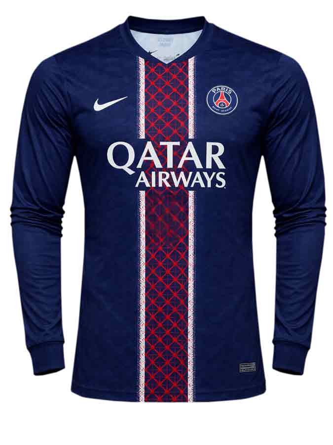The PSG Home Jersey 25-26 Season Long Sleeves Premium is a comfortable premium fan-fit long-sleeve jersey made for matchdays, travel, and cooler-weather wear. It delivers the standout 25–26 home-kit design with a clean finish, while the full sleeves add extra coverage and styling for layered outfits. Customisation is available—add a name and number in original PSG-style fonts and colours.
